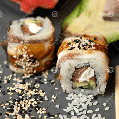 Fijne tempura scampi, paling. Gember, komkommer en avocado met topping van masago